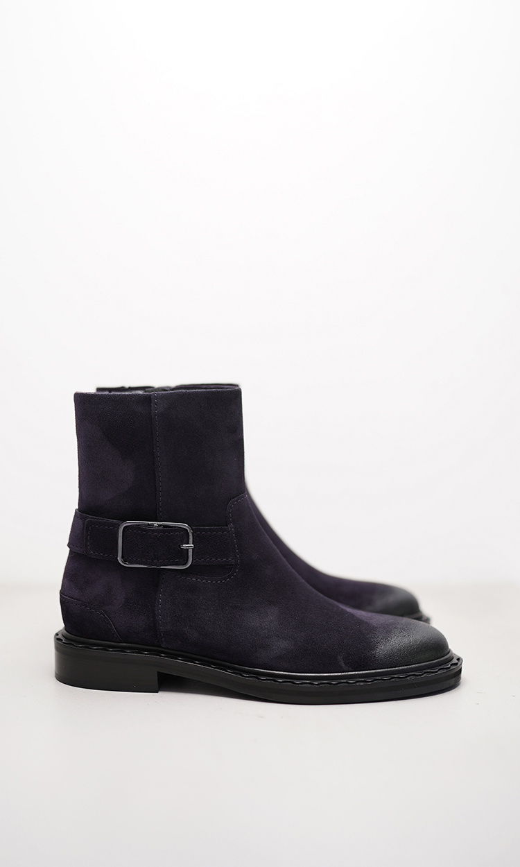 Klassisch mit modernem Twist: Diese dunkelblaue Stiefelette aus softem Veloursleder überzeugt mit einer klaren Formensprache und feinen Details. Der dunkle Blauton bringt Tiefe und Eleganz in jede Herbst- und Wintergarderobe. Die schlichte Metallschnalle in Silber unterstreicht den urbanen Look mit einem dezenten, stilvollen Statement. Ein seitlicher Reißverschluss sorgt für einfaches Anziehen, die Leder-Gummisohle bietet Stabilität im Alltag. Ob zur dunklen Denim, zum Wollrock oder zum Mantel – ein souveräner Stylingpartner mit zurückhaltendem Charakter.