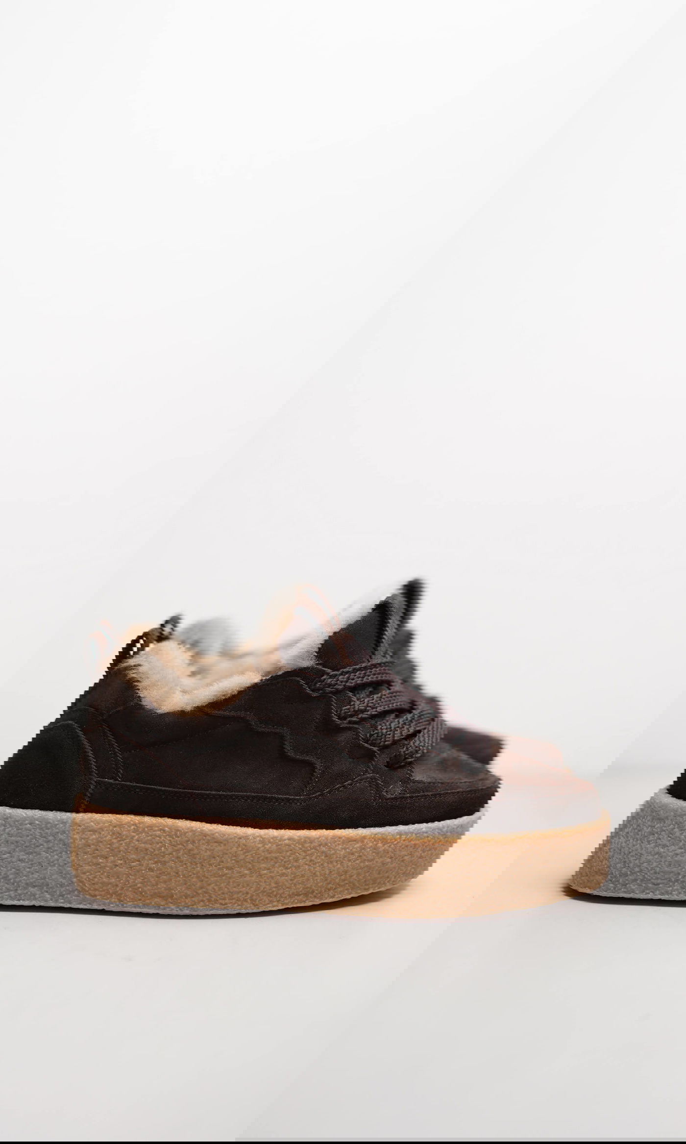 Dieser hochwertige BAZAR Sneaker aus dunkelbraunem Veloursleder überzeugt durch seinen individuellen Look und seine funktionalen Details. Die zahlreichen Ziernähte am Oberleder unterstreichen das handwerkliche Design und verleihen dem Schuh eine dynamische, strukturierte Optik. Das kuschelige Lammfellfutter sorgt für angenehme Wärme und weichen Tragekomfort – ideal für die kühleren Monate. Die erhöhte Crepesohle in Naturbeige bringt nicht nur einen modernen Twist ins Spiel, sondern bietet auch einen angenehmen Laufkomfort.