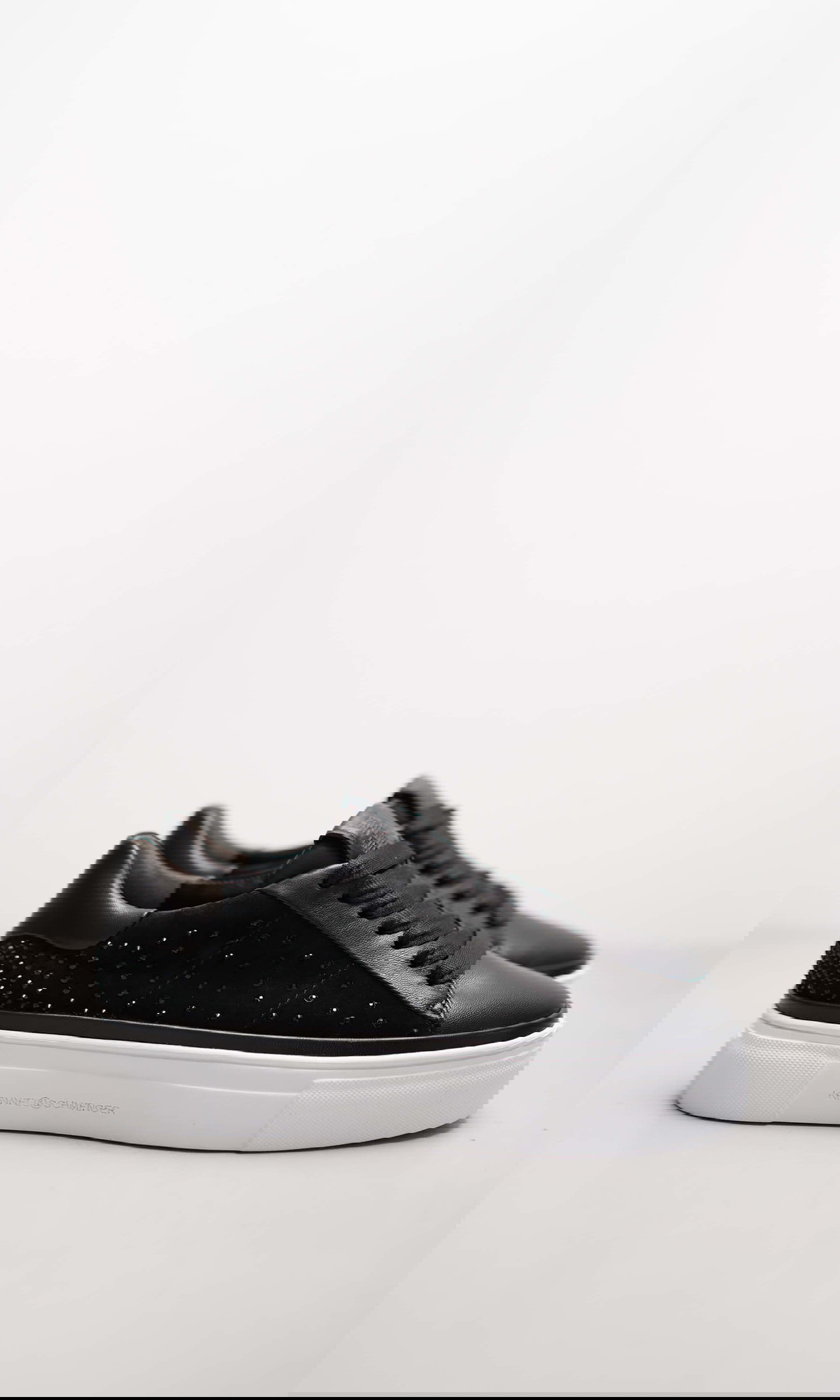 Der Sneaker FIX vereint sportiven Komfort mit einem Hauch Glamour. Das schwarze Nappaleder in Kombination mit softem Velours und funkelnden Strass-Details sorgt für einen edlen Look mit dezentem Statement. Die weiße Plateausohle verleiht dem Design eine moderne Silhouette und macht den Sneaker zum vielseitigen Begleiter für urbane Outfits.