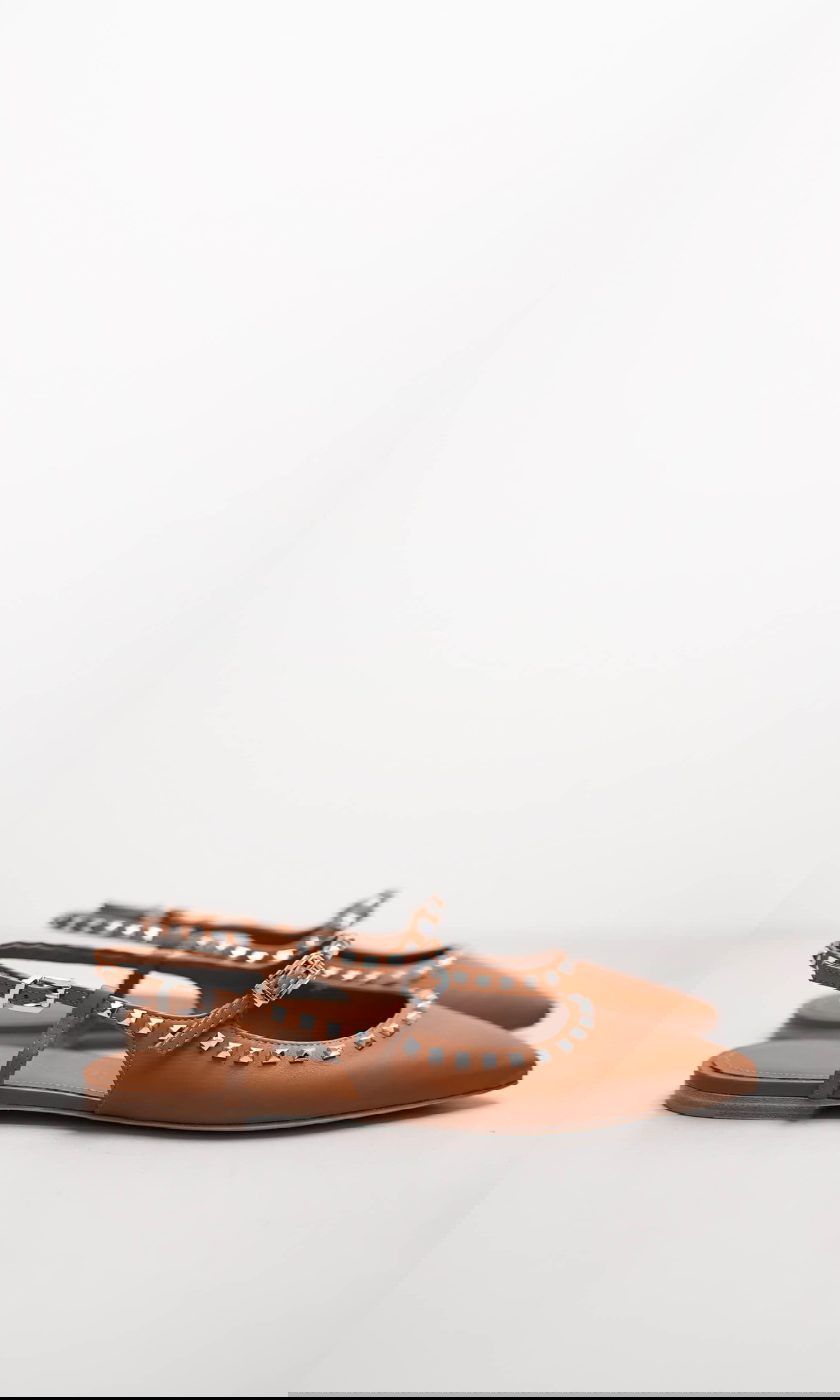 Der Ballerina GRETA in Cognac kombiniert zeitlose Eleganz mit einem modernen, rockigen Twist. Gefertigt aus weichem Soft-Calf-Leder bietet er höchsten Tragekomfort. Silberfarbene Nieten entlang der Kanten verleihen dem femininen Design eine markante Note. Der feine Riemen sorgt für perfekten Halt und rundet das stilvolle Gesamtbild ab – ein vielseitiger Begleiter für Alltag und Abendlooks.