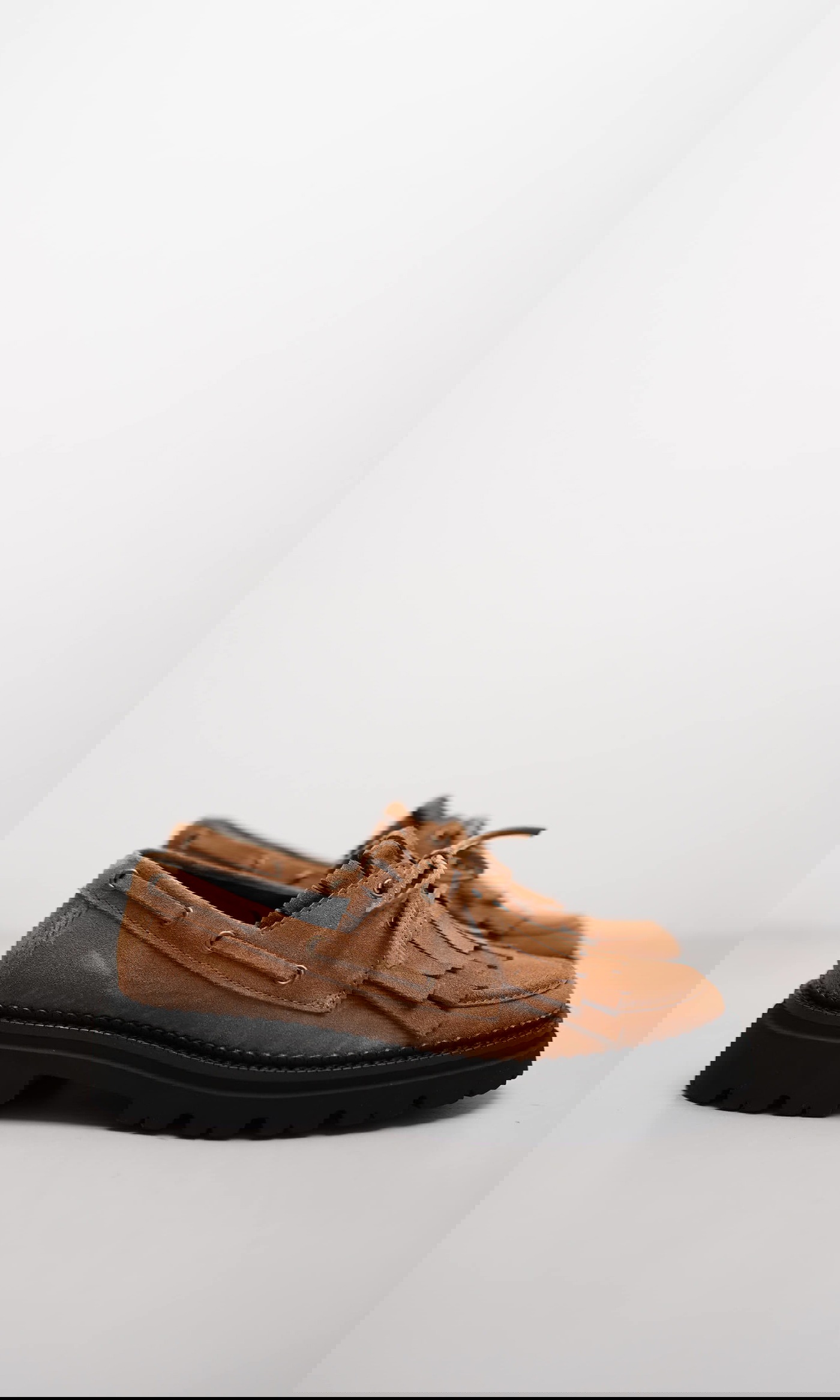 Markant und stilvoll – unser Loafer-Modell setzt mit seinem auffälligen Fransen-Design ein modisches Statement. Das weiche Veloursleder verleiht dem Schuh eine edle Haptik, während die kräftige Profilsohle dem Look eine moderne Note und urbanen Charakter verleiht. Die umlaufende Schnürung greift maritime Elemente auf und sorgt für eine lässige Optik. Dank des hochwertigen Leders bietet der Loafer nicht nur Stil, sondern auch höchsten Tragekomfort – ideal für selbstbewusste Looks mit modischer Raffinesse.