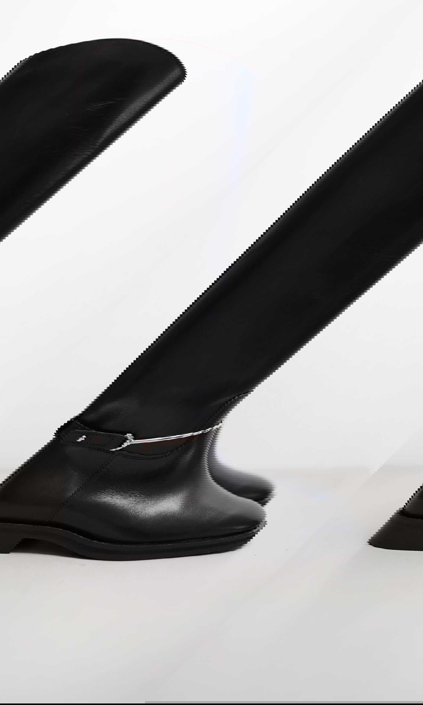 Eleganz in ihrer reinsten Form: Dieser edle JONA Stiefel aus hochwertigem, schwarzem Kalbleder überzeugt durch seine klare Linienführung und luxuriöse Verarbeitung. Das feine, glatte Leder verleiht dem Modell eine glänzende, fast makellose Oberfläche, die zeitlose Klasse und moderne Zurückhaltung ausstrahlt. Angelehnt an die klassische Reiterstiefel-Silhouette, wirkt der Stiefel zugleich sportlich und stilvoll. Ein silberner Bügel am Knöchel setzt einen dezenten, metallischen Akzent und unterstreicht die exklusive Optik. Als praktischer Schlupfstiefel gestaltet, lässt sich das Modell mühelos anziehen und schmiegt sich elegant ans Bein. Die Sohle aus einer hochwertigen Leder-Gummi-Kombination sorgt für eine stilvolle Erscheinung und angenehme Trittsicherheit. Ob zum eleganten City-Look oder als edles Highlight im Alltag – dieser Stiefel vereint Tradition und moderne Raffinesse auf besonders stilvolle Weise.