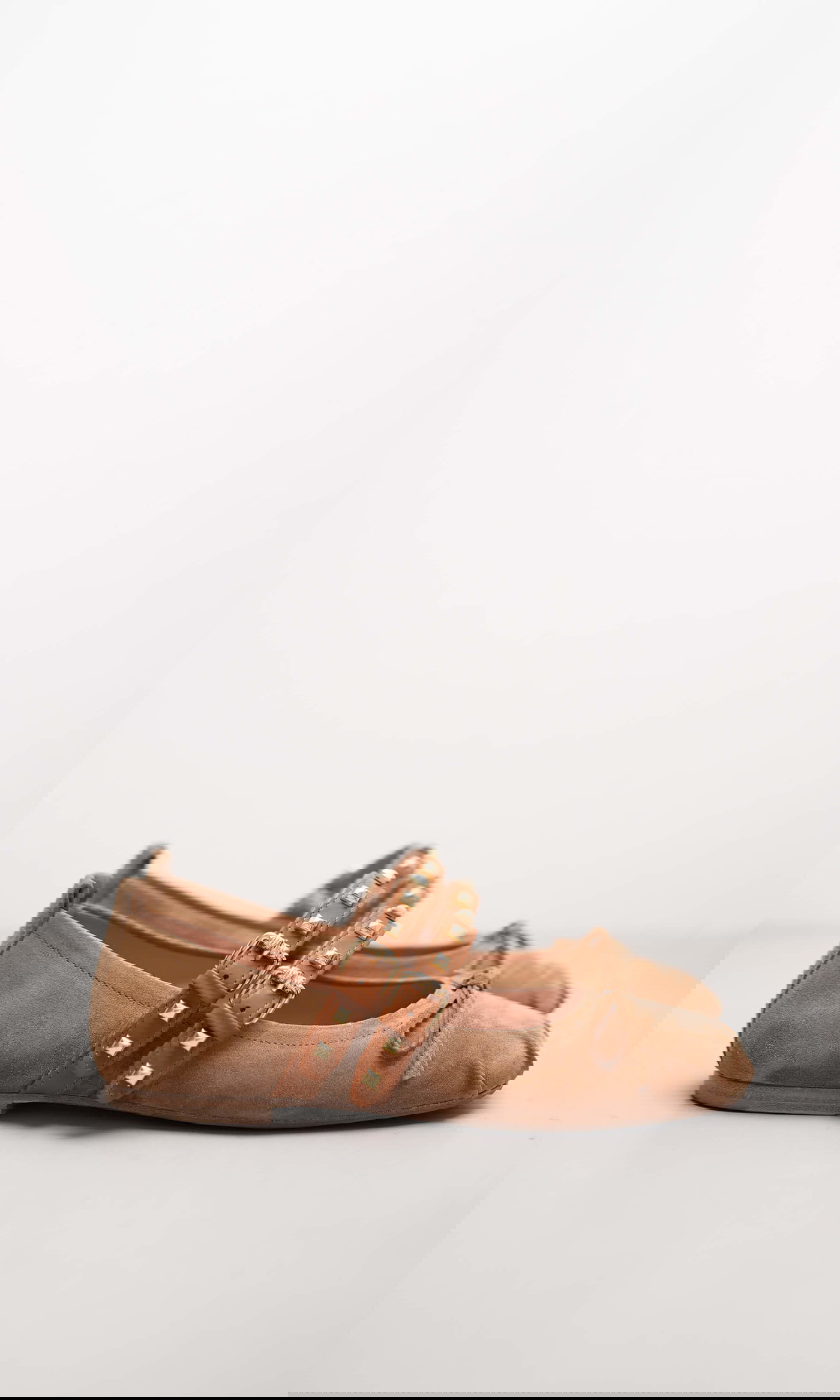 Der Ballerina LOLA vereint feminine Raffinesse mit einem Hauch Coolness. Das weiche Veloursleder in warmem Braunton sorgt für eine edle Optik, während die doppelten Riemen aus glattem Nappaleder mit goldfarbenen Nieten für ein modisches Statement sorgen. Eine zarte Schleife auf der Vorderkappe rundet das Design stilvoll ab – ein trendiger Begleiter für jeden Tag.
