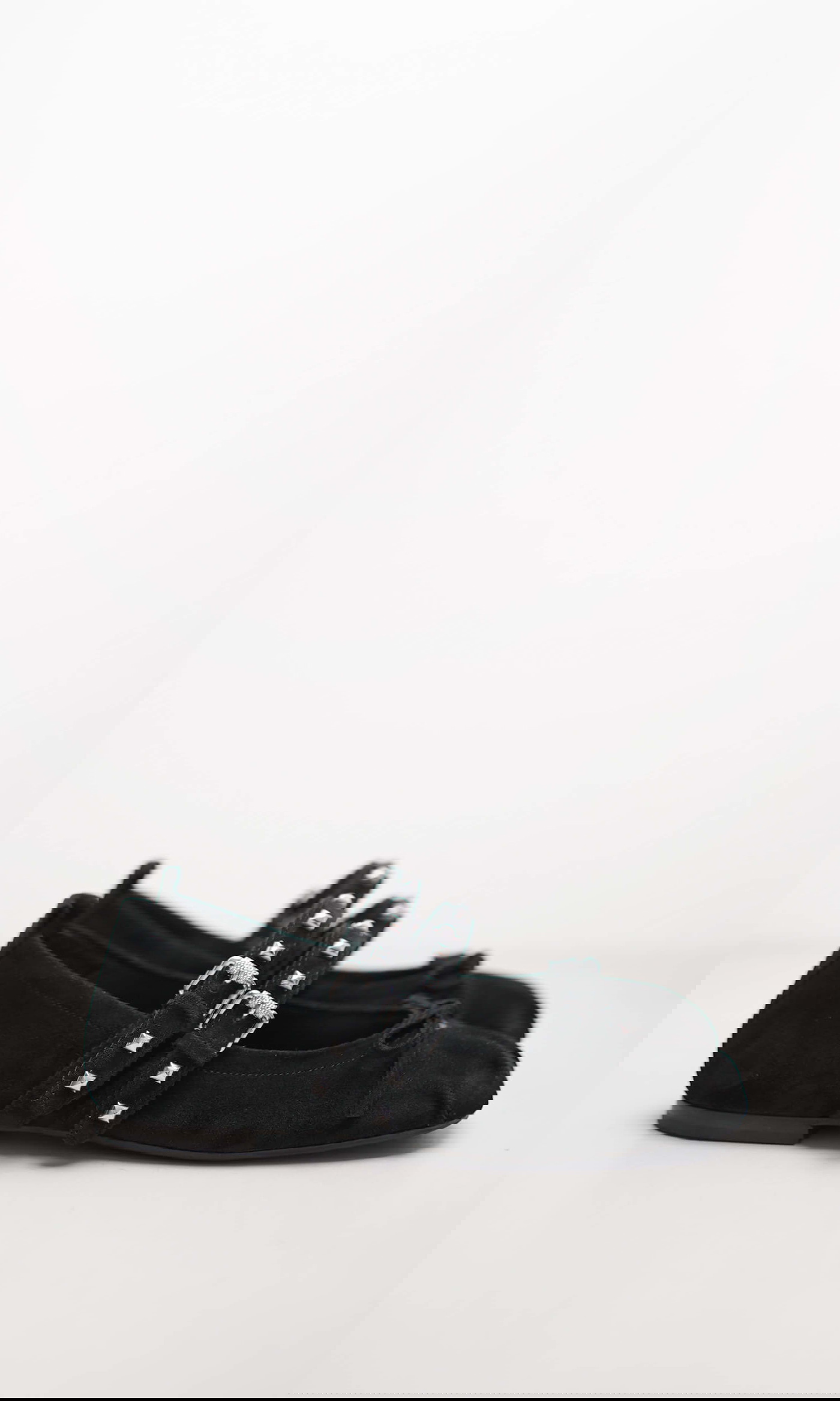 Unser Ballerina LOLA vereint feminine Eleganz mit einem modernen Edge. Weiches Velours- und Nappaleder in tiefem Schwarz sorgt für eine luxuriöse Haptik, während die markanten Riemen mit Nieten einen selbstbewussten Akzent setzen. Die feine Schleife an der Vorderkappe rundet das Design mit einer subtilen Note von Leichtigkeit ab – ein stilvolles Statement für Alltag und Abend.