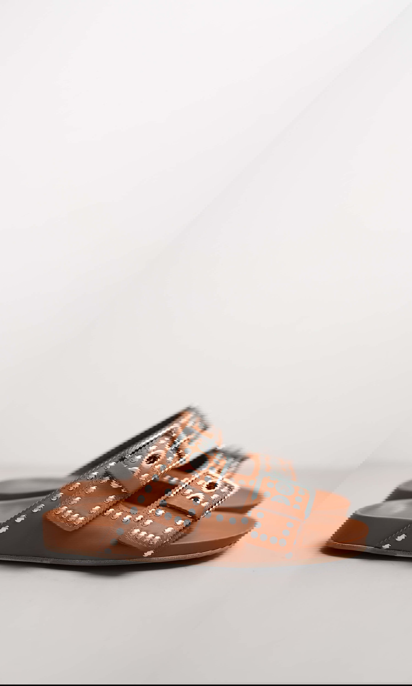 Diese moderne Pantolette in warmem Cognac kombiniert weiches Soft-Calf-Leder mit auffälligen Nietenakzenten und zwei großen, markanten Schnallen. Das handwerklich hochwertig verarbeitete Modell bietet dank gepolsterter Innensohle angenehmen Tragekomfort und einen lässig-edlen Look – perfekt für sommerliche Outfits mit modischem Statement.