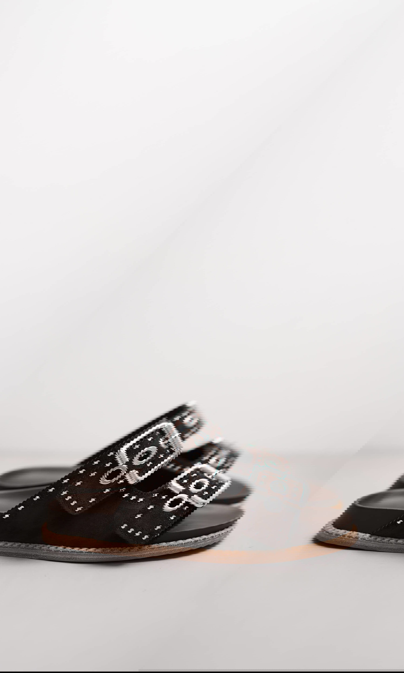 Die Pantolette MIMI in tiefem Braun verbindet lässige Modernität mit markanten Details. Zwei breite Riemen aus weichem Veloursleder werden von großen, silberfarbenen Schnallen und feinen Nieten verziert – ein Look, der sofort ins Auge fällt. Die flache, komfortable Sohle macht sie zum idealen Begleiter für entspannte Alltagsoutfits mit modischem Anspruch.
