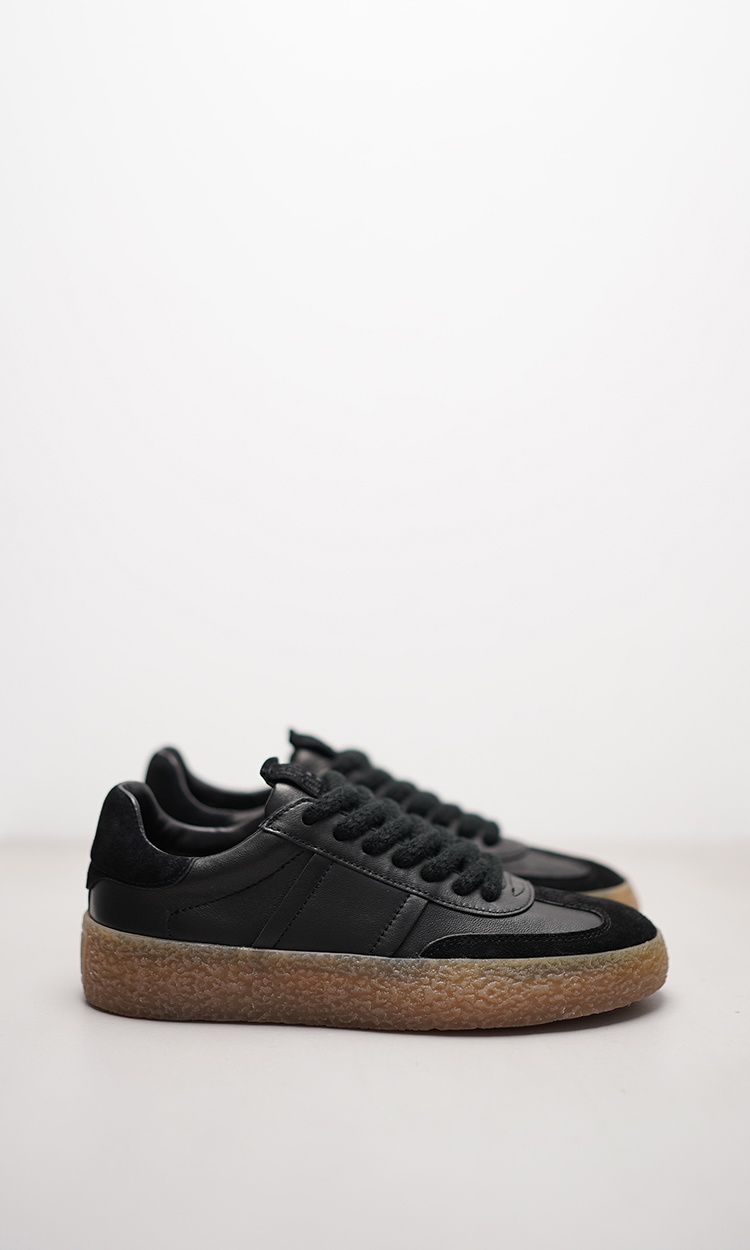Dieser sportive Sneaker PIT vereint stilvolles Design mit hochwertiger Verarbeitung. Das edle Obermaterial aus schwarzem Nappaleder verleiht dem Schuh eine glatte, elegante Optik, während dezente Details aus Veloursleder für einen spannenden Materialkontrast sorgen. Die helle honigfarbene Crépe-Sohle rundet das Design nicht nur optisch ab, sondern bietet auch hervorragenden Tragekomfort und Griffigkeit. Ein perfekter Begleiter für anspruchsvolle Looks – ob casual oder smart kombiniert.